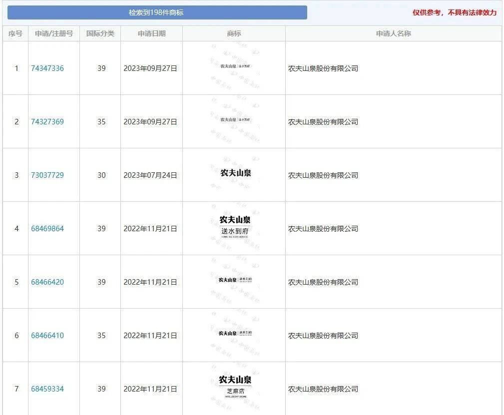 跟着农夫山泉的做大做强,越来越多的跟风仿照品牌呈现,为了防止被别人“蹭热度”,农夫山泉一口吻申请注册了198个“农夫山泉”相关的商标,注册类别几乎笼盖了商标所有的类型。
