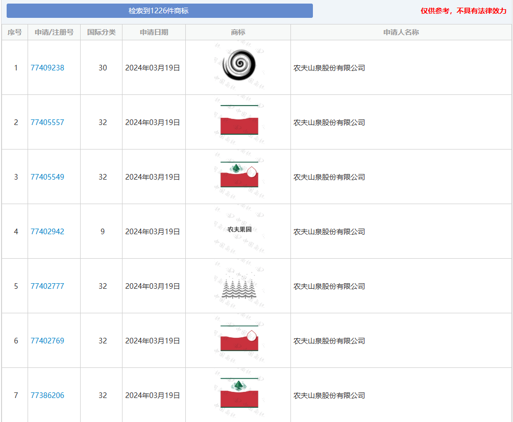 农夫山泉股份无限公司成立于1996年,中国饮料20强之一,是正在中国市场上同时具备规模性、成长性和盈利能力的饮料龙头企业。截至2024年,农夫山泉股份无限公司递交的商标申请有1226个。由此可见农夫山泉对商标注册的注沉程度。