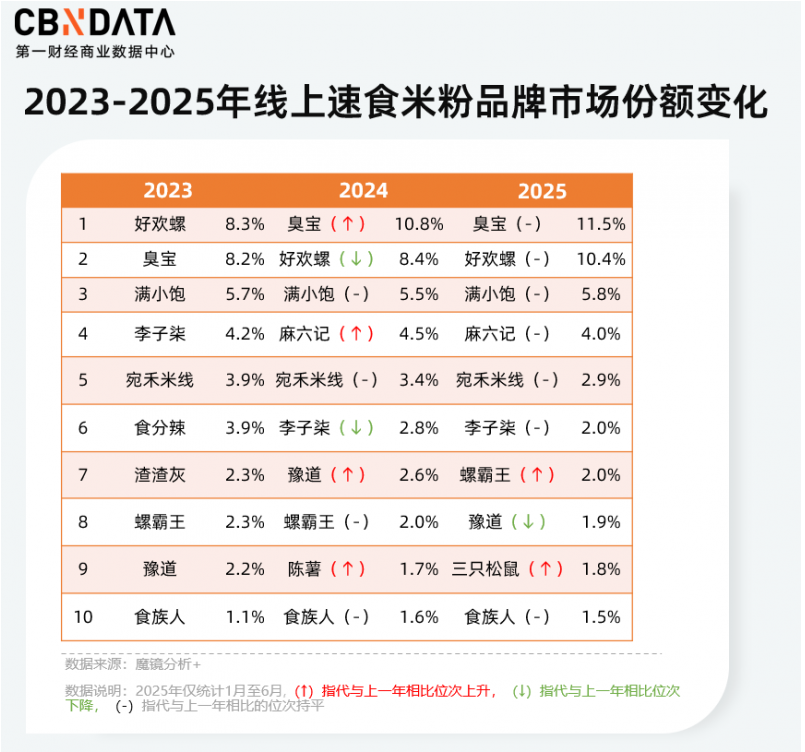 微念集团合做运营了包罗速食物牌臭宝、李子柒,和专注米粉米线供应链办事的品牌兴农微念,为线下粉类终端供给大原材料供给。魔镜数据显示,臭宝持续两年连任线上速食米粉市场份额首位,且市场份额增速领先,从2023年的8。2%攀升至2025年的11。5%,是当之无愧的螺蛳粉市场第一品牌。除此之外,微念集团和李子柒品牌持续三年(2021-2023)全国螺蛳粉发卖额第一。